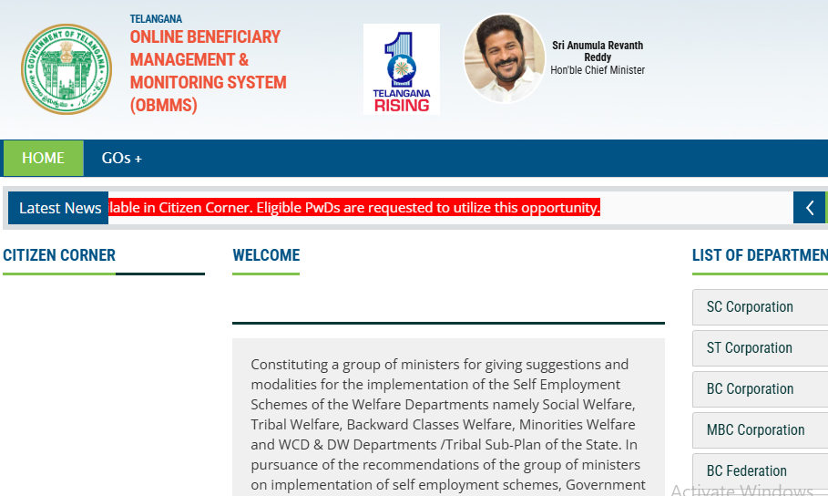 Step 1: Visit the Official Website- Go to the official Telangana OBMMS (Online Beneficiary Management and Monitoring website. It is the site from which you apply for the Rajiv Yuva Vikasam Scheme 2025.
